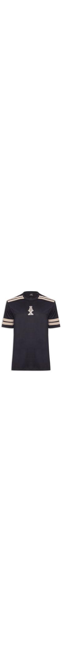 A camiseta azul marinho é confeccionada em malha de algodão com média elasticidade. A peça solta ao corpo possui gola careca com acabamento canelado, mangas curtas, faixas na cor bege aplicada nas mangas e nos ombros e logo da marca bordado na parte frontal.