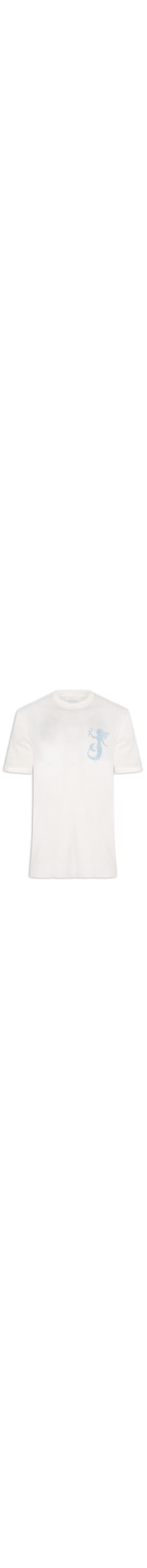 A t-shirt branca é confeccionada em linho misto com baixa elasticidade. A peça solta ao corpo possui gola redonda, mangas curtas, barra com corte a fio, e estampa figurativa de sereia na cor azul na parte frontal do tórax.