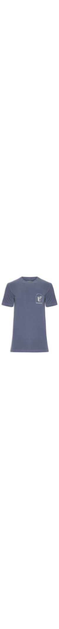 A camiseta azul é confeccionada em malha de algodão com média elasticidade. A peça solta ao corpo possui gola redonda com acabamento canelado, mangas curtas, estampa frontal escrita e figurativa aplicada em silk de tons contrastantes e efeito estonado.