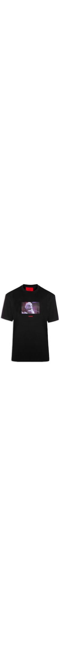 A t-shirt preta é confeccionada por malha de algodão com média elasticidade. A peça solta ao corpo possui gola careca com acabamento canelado, mangas curtas, estampa figurativa frontal e posterior em cor contrastante e nome da marca aplicado na cor vermelha na parte frontal.