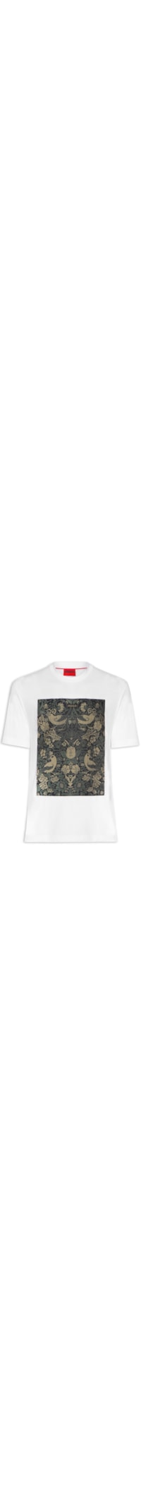 A camiseta branca é confeccionada em malha de algodão com média elasticidade. A peça solta ao corpo possui gola careca com acabamento canelado, mangas curtas, estampa figurativa texturizada em cores contrastantes aplicada na parte frontal.
