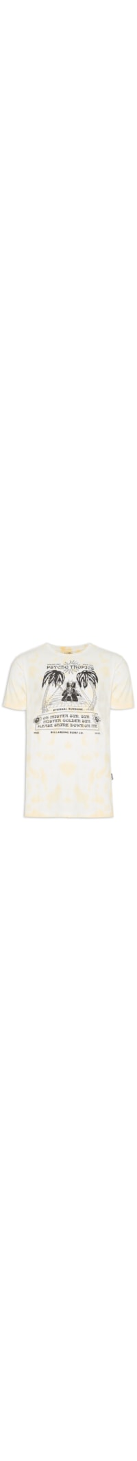 A camiseta amarela é confeccionada em malha de algodão. A peça possui gola redonda canelada, mangas curtas, estampa em silk aplicada na parte frontal, caimento reto, efeito tie dye e acabamento pespontado.