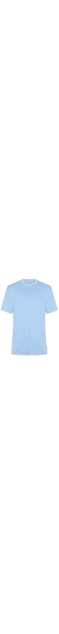 A camiseta azul é confeccionada em malha de algodão com alta elasticidade. A peça solta ao corpo possui gola careca com acabamento canelado, mangas curtas, ombros estendidos, efeito estonado e nome e logo da marca bordados em tom contrastante na parte frontal.