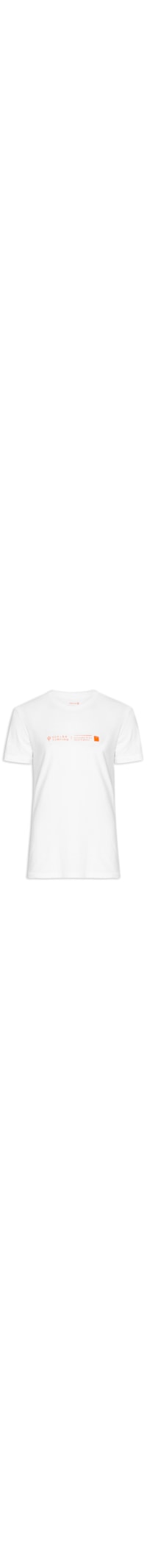 A camiseta branca é confeccionada em malha de algodão com média elasticidade. A peça de modelo slim solta ao corpo possui gola careca com acabamento canelado, mangas curtas e estampa frontal em silk na cor laranja.