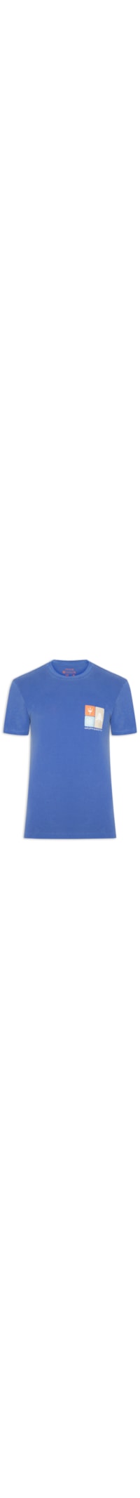 A camiseta azul é confeccionada em malha de algodão com baixa elasticidade. A peça solta ao corpo possui gola careca, mangas curtas, mix de estampas aplicadas na parte frontal em cores contrastantes e efeito estonado.
