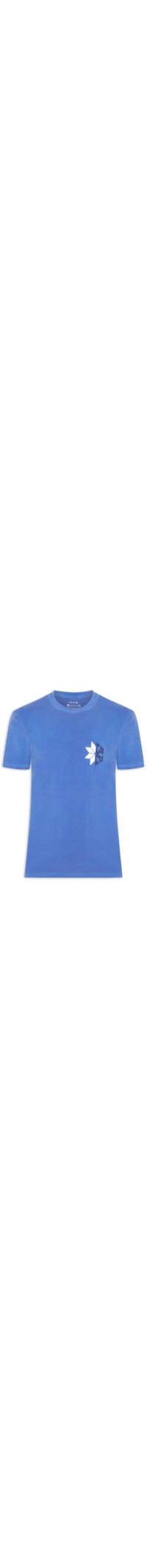 A camiseta azul é confeccionada em tecido leve com baixa elasticidade. A peça solta ao corpo possui gola arredondada com acabamento canelado, mangas curtas, estampa aplicada em silk na cor preto e branco na parte frontal no tórax e na parte posterior.