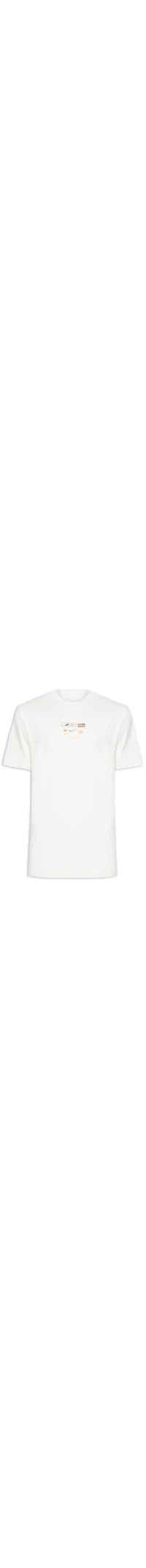 A camiseta off white é confeccionada em malha de algodão com baixa elasticidade. A peça solta ao corpo possui gola redonda com acabamento canelado, mangas curtas, ombros estendidos e estampa metalizada em silk na parte frontal e posterior do tórax.
