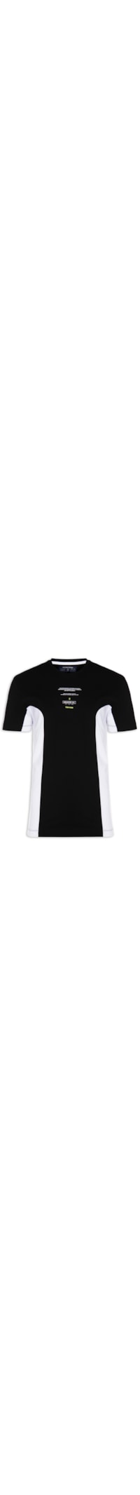 A camiseta preta é confeccionada em malha de algodão. A peça possui gola careca canelada, mangas curtas, estampa frontal de escrita em silk e cores contrastantes, logo da marca estampado na parte posterior em cor contrastante, recortes laterais em cor contrastante, shape solto, caimento reto e acabamento pespontado.