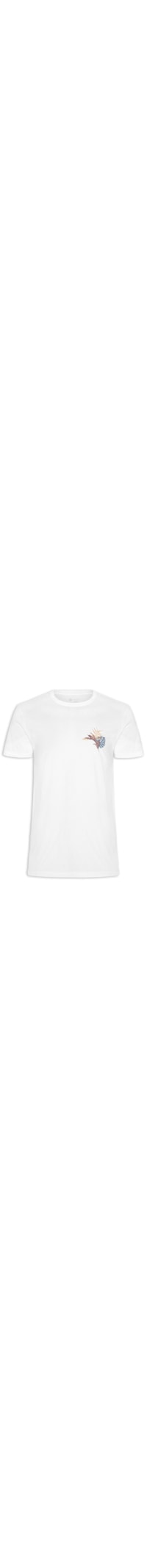A t-shirt branca é confeccionada em malha de algodão com baixa elasticidade. A peça solta ao corpo possui gola careca com acabamento canelado e logo da marca aplicado em silk na parte posterior, mangas curtas, estampa figurativa de folhagens aplicadas em silk na parte frontal do tórax.