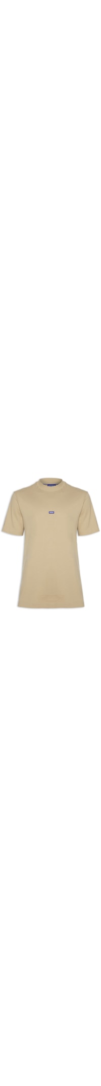 A Camiseta bege é confeccionada em malha de algodão com baixa elasticidade. A peça solta ao corpo possui gola redonda com acabamento canelado, mangas curtas, e tag da marca aplicada na parte frontal do tórax em cor contrastante.