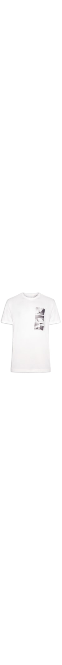 A Camiseta off white é confeccionada em malha de algodão. A peça possui gola careca com acabamento canelado, mangas curtas, ombros estendidos, estampa frontal em silk com cor contrastante, recorte posterior, shape solto, caimento reto e acabamento pespontado.