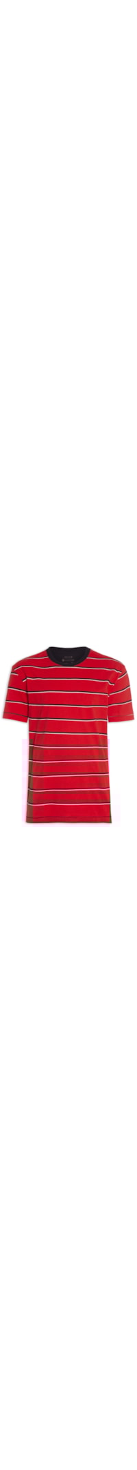 A t-shirt vermelha é confeccionada em malha de algodão. A peça possui gola careca com acabamento canelado, mangas curtas, padronagem de listras em cores contrastantes, shape solto, caimento reto e acabamento pespontado.