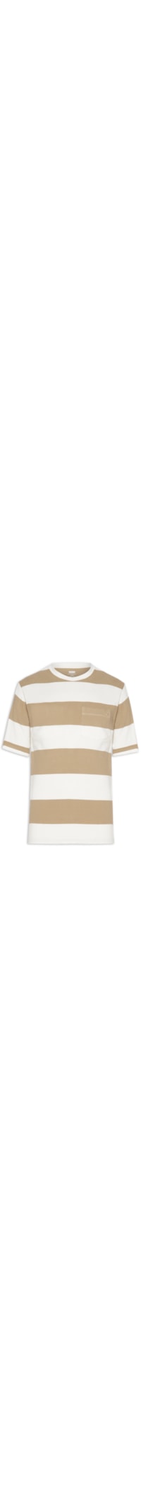 A camiseta bege é confeccionada em malha de algodão com superfície texturizada com alta elasticidade. A peça solta ao corpo possui decote redondo com gola em ribana, mangas curtas, bolso frontal, logo da marca bordada na parte frontal e padronagem de listras em cor contrastante.