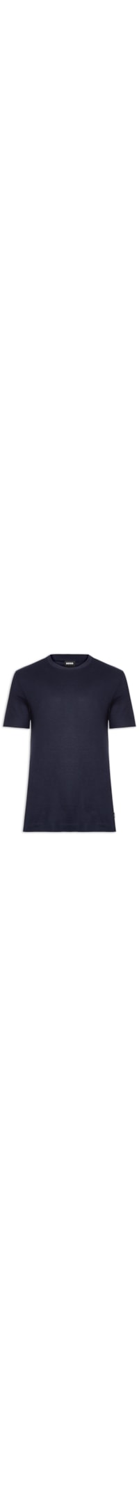 A camiseta azul é é confeccionada em malha leve com média elasticidade. A peça solta ao corpo possui gola careca com acabamento texturizado, fendas laterais, tag lateral com o nome da marca e mangas curtas.