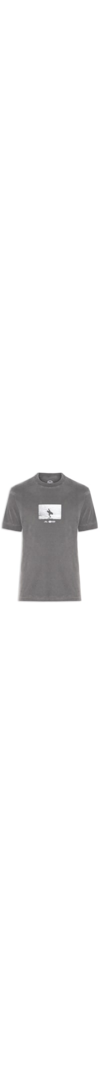 A camiseta cinza é confeccionada em malha de algodão com média elasticidade. A peça solta ao corpo possui gola careca com acabamento canelado, mangas curtas e estampa frontal aplicadas em silk.