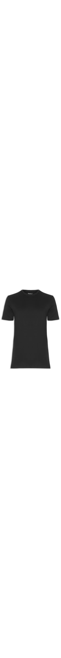 A camiseta preta é confeccionada por malha de algodão com média elasticidade. A peça solta ao corpo possui gola careca com acabamento canelado e mangas curtas.