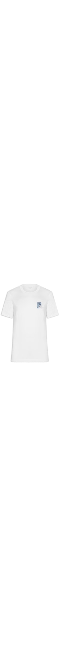 A camiseta branca é confeccionada em malha de algodão com média elasticidade. A peça solta ao corpo possui gola redonda, mangas curtas e estampa frontal e nome da marca em cores contrastantes.
