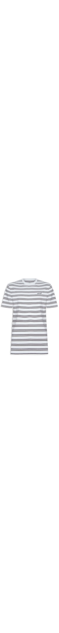 A Camiseta azul é confeccionada em malha de algodão com média elasticidade. A peça solta ao corpo possui gola redonda com acabamento canelado, mangas curtas, nome da marca bordado na altura do tórax em cor contrastante e padronagem listrada em cores contrastantes.