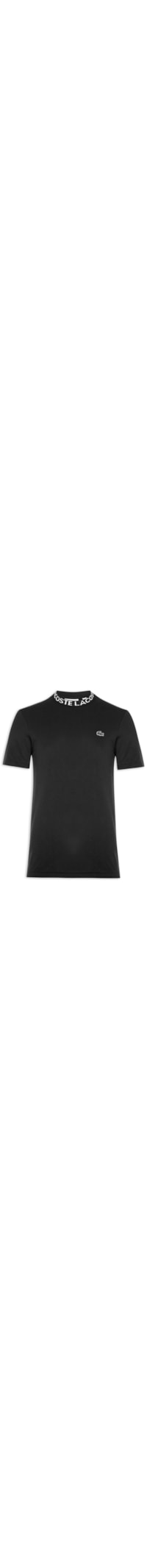 A camiseta preta é confeccionada em malha piqué com baixa elasticidade. A peça solta ao corpo possui gola redonda, mangas curtas, gola com logo da marca gravado em jacguard, logo da marca estampado em silicone na parte frontal e cores contrastantes.