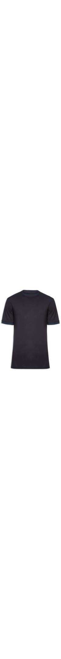 A camiseta azul é confeccionada em malha leve de média elasticidade. A peça possui gola careca com acabamento canelado com detalhe de listra e mangas curtas com detalhe de listra em cor contrastante.