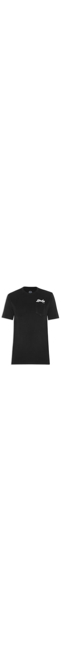 A camiseta preta é confeccionada em malha de algodão com média elasticidade. A peça solta ao corpo possui gola redonda com acabamento canelado, mangas curtas, bolso frontal e nome da marca aplicado em silk de cor contrastante na parte frontal do toráx.