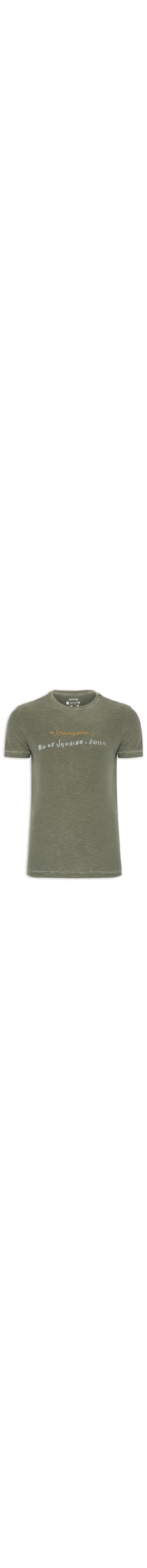 A Camiseta verde é confeccionada por malha de algodão com média elasticidade. A peça solta ao corpo possui gola careca com acabamento canelado, mangas curtas e escrita estampada na altura do tórax em cor contrastante.