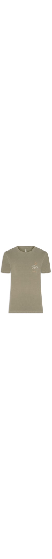 A t-shirt bege é confeccionada em malha de algodão de baixa elasticidade. A peça solta ao corpo, possui gola careca com acabamento canelado, mangas curtas, estampa frontal em slik na altura do tórax e logo da marca em cor contrastante na parte posterior.