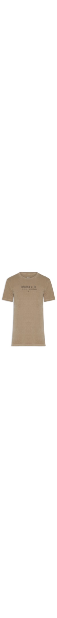 A camiseta bege é confeccionada em malha de algodão com média elasticidade. A peça de modelo slim solta ao corpo possui gola careca com acabamento canelado, mangas curtas, logo da marca estampado na parte posterior na cor cinza e estampa frontal em silk na cor cinza.