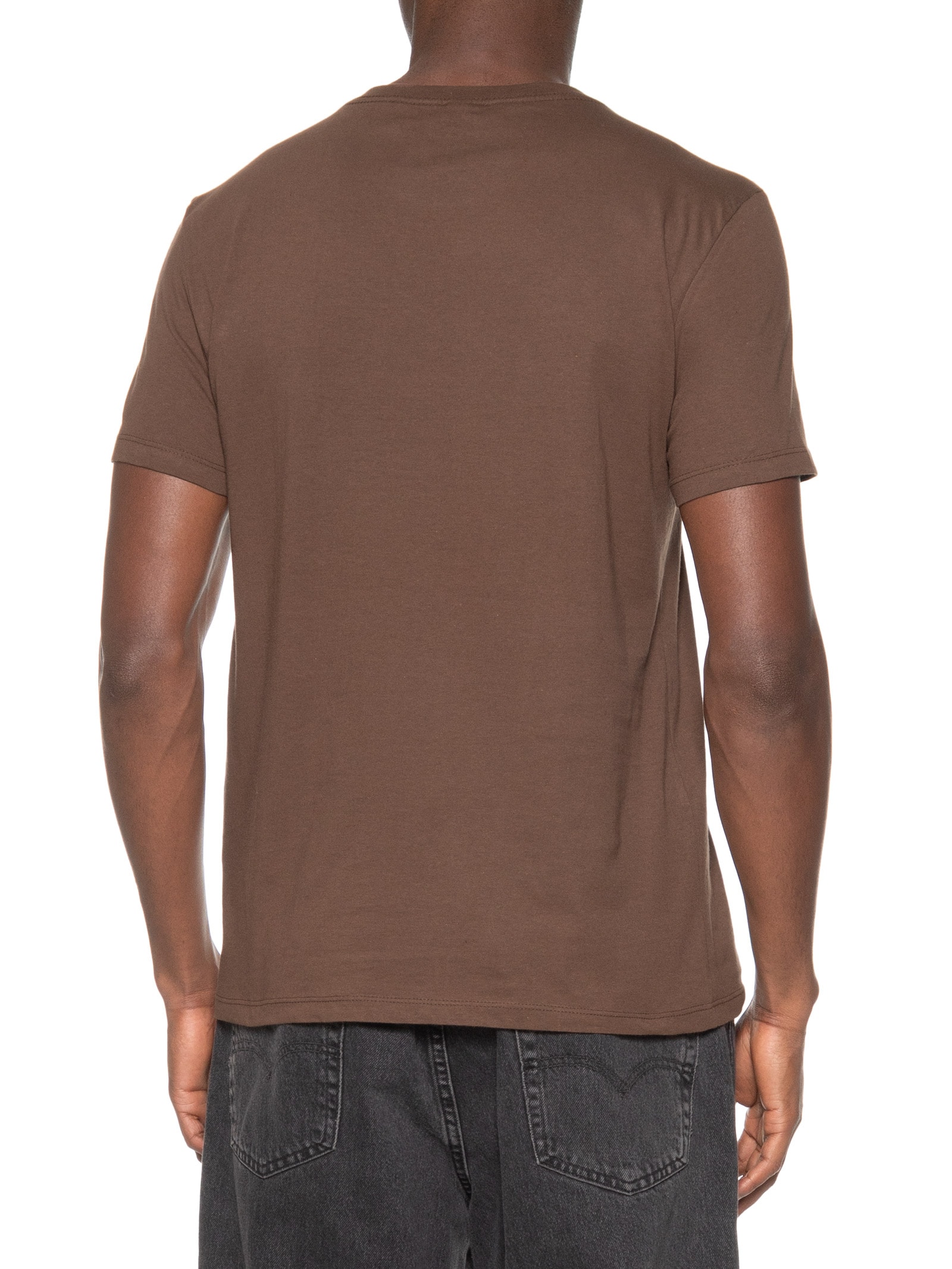 A camiseta marrom é confeccionada em malha de algodão sem elasticidade. A peça solta ao corpo possui gola careca com acabamento canelado, mangas curtas e estampa figurativa com logo da marca aplicado em cor contrastante na parte frontal.