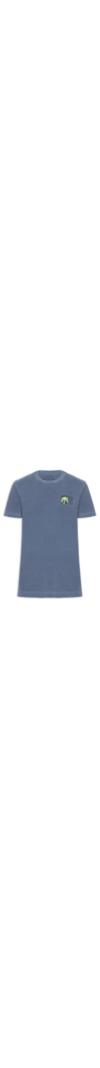 A camiseta azul é confeccionada em malha de algodão com média elasticidade. A peça solta ao corpo possui gola careca com acabamento canelado, mangas curtas, estampa figurativa em cores contrastantes na altura do tórax e efeito estonado.