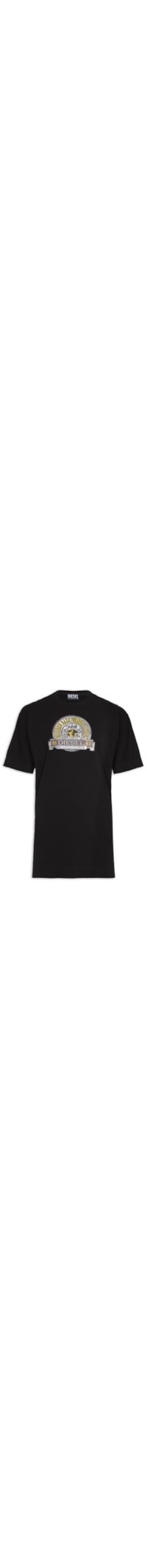 a t-shirt Preta é Confeccionada Em malha De Algodão. a Peça Possui Gola Careca Com Acabamento Canelado, Ombros Estendidos, Mangas Curtas, Estampa Plástica Em Relevo Com Cores Contrastantes Aplicada Na Parte Frontal, Shape Solto, Caimento Reto E Acabamento Pespontado.