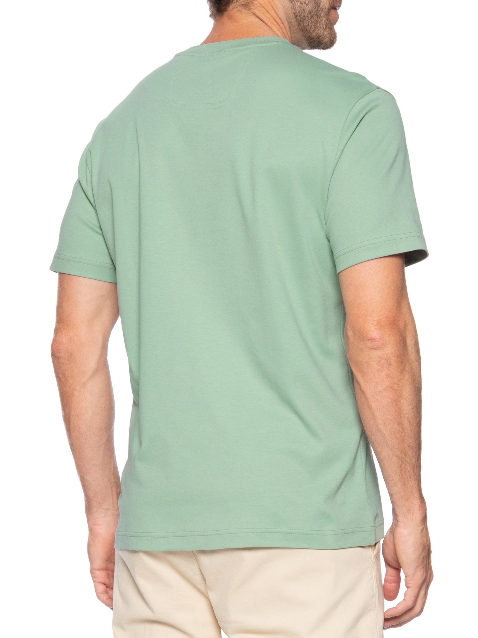 A camiseta verde é confeccionada em malha de algodão com baixa elasticidade. A peça solta ao corpo possui gola careca com acabamento canelado, mangas curtas e estampa frontal em silk com superfície texturizada na cor cinza.