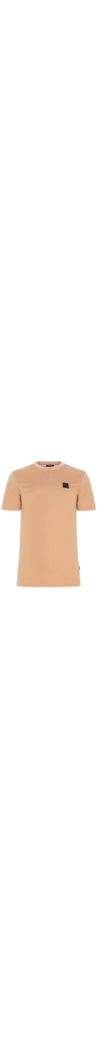 A t-shirt marrom é confeccionada em malha de algodão com baixa elásticidade. A peça solta ao corpo possui gola careca com acabamento canelado, mangas curtas, nome da marca aplicado em cor contrastante e superfície emborrachada na parte frontal na altura do tórax e tag da marca aplicada na lateral.