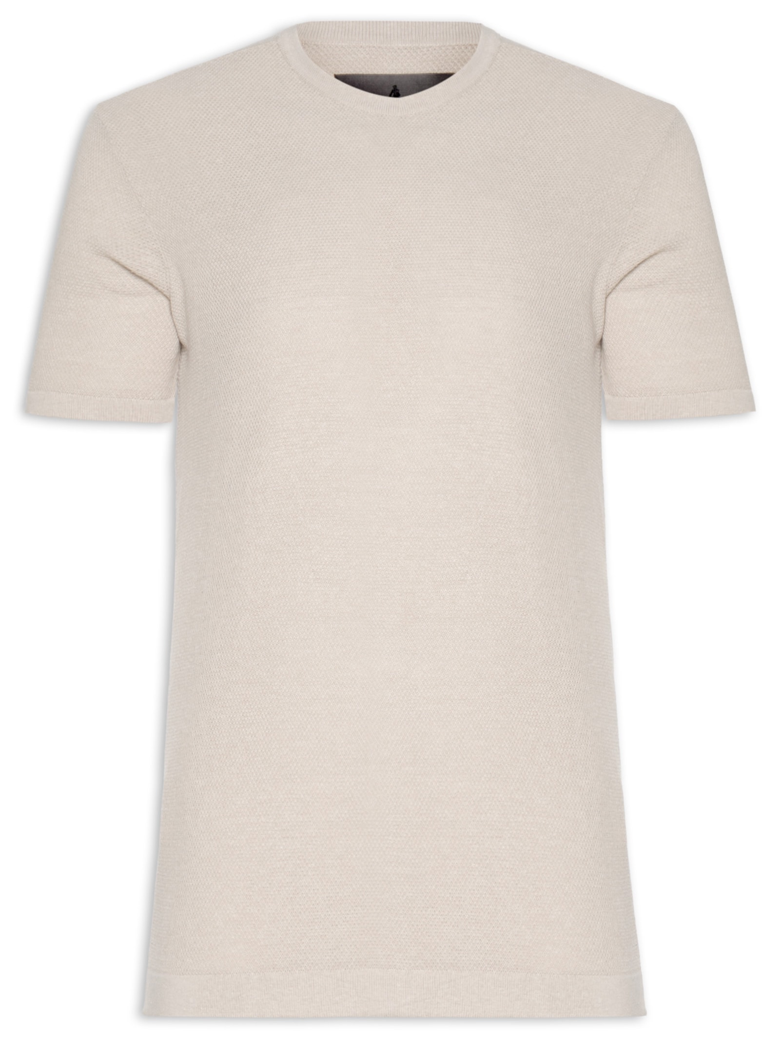 A camiseta bege é confeccionado em tricot com alta elasticidade. A peça solta ao corpo possui gola arredondada e mangas curtas com acabamento canelado.