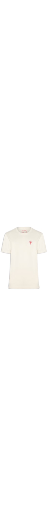 A camiseta bege é confeccionada em malha de algodão sem elasticidade. Possui modelagem reta, gola careca com acabamento canelado, mangas curtas e estampa frontal localizada com símbolo tridente em contraste. O modelo apresenta caimento confortável e acabamento simples na barra. Produto original.