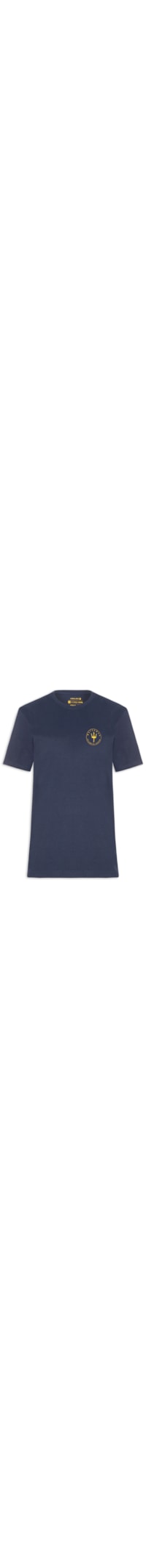 A camiseta azul é confeccionada em tecido leve com média elasticidade. A peça solta ao corpo possui gola careca com acabamento canelado, mangas curtas e estampa figurativa em cor contrastante aplicada nas partes frontal e posterior.