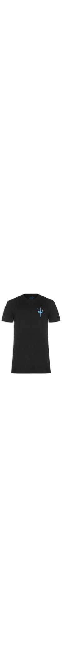 A camiseta preto é confeccionada por malha com média elasticidade. A peça possui gola careca com acabamento canelado, mangas curtas e estampa figurativa de tridente na cor azul.