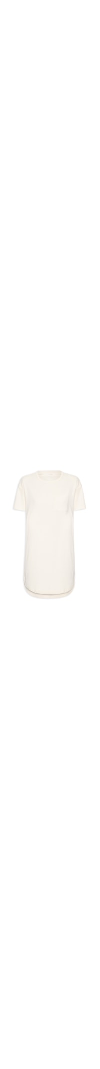 A camisola bege é confeccionada em malha de algodão de média elasticidade. A peça solta ao corpo, possui decote redondo com acabamento canelado, mangas curtas, bolso frontal na altura do busto, barra arredondada e comprimento curto.