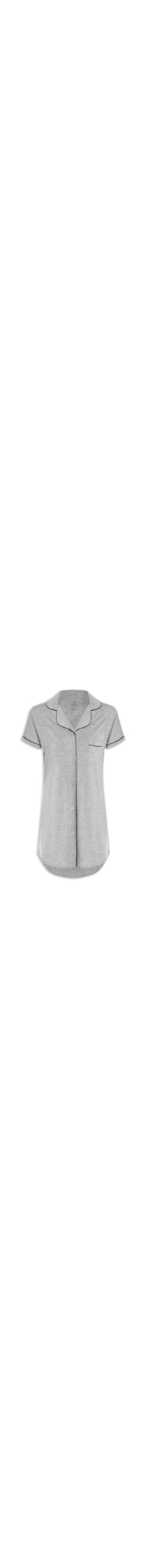 A camisola cinza é confeccionada em malha de algodão pima. A peça possui decote V com pala aplicada, mangas curtas modelo japonesa, bolso na parte frontal na altura do busto, recorte posterior, detalhe em viés de cor contrastante, barra mullet arredondada, comprimento curto, caimento reto, acabamento pespontado e fechamento frontal por botões.