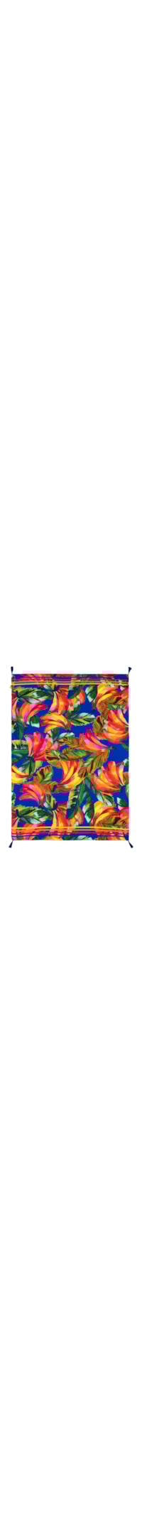A canga azul é confeccionada em tecido leve sem elasticidade. A peça possui tamanho grande, formato retangular, mix de estampas em cores contrastantes e tasseis aplicados. Acompanha bolsa pequena com para uso opcional em tactel com parte frontal em material sintético com detalhe de estampa figurativa de bananas nas cores amarelo e marrom e fechamento superior por zíper com gancho metálico.