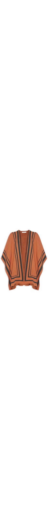 A capa marrom é confeccionada em tricot com superficie canelada sem elasticidade.A peça possui mangas longas, ombros estendidos, barra assimétrica, padronagem de faixas em cor contrastante preto, fendas laterais, acabamento canelado e não possui fechamento.
