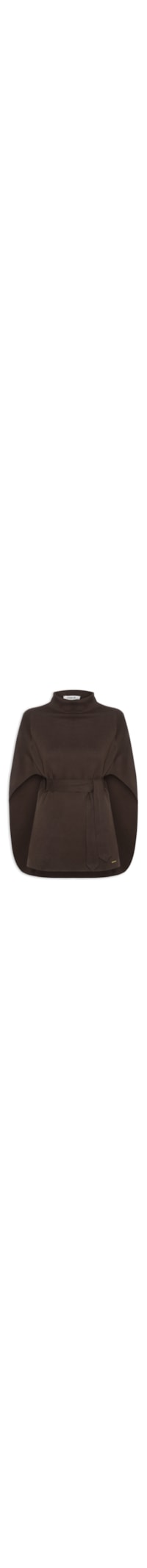 A capa marrom é confeccionada em malha levemente encorpada com média elasticidade. A peça solta ao corpo possui gola alta, ombros estendidos e mangas amplas com modelagem estilo capa, caimento amplo, detalhe de cinto do mesmo tecido aplicado na altura da cintura para amarração frontal, barra reta e acabamento pespontado.