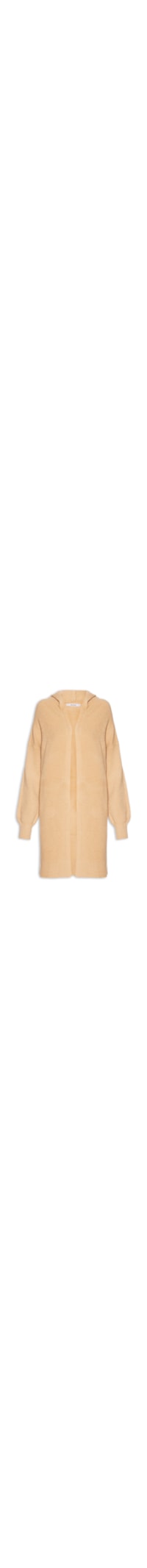 O cardigã bege é confeccionado em tricot com média elasticidade. A peça solta ao corpo possui capuz embutido, decote frontal aberto, mangas longas com punhos ajustados, ombros deslocados e acabamento canelado na barra.