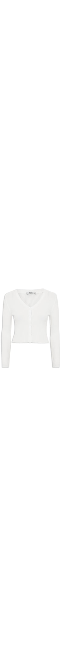 O cardigã off white é confeccionado em tricot canelado com média elasticidade. A peça solta ao corpo possui decote V, mangas longas, comprimento cropped* e fechamento frontal por botões.