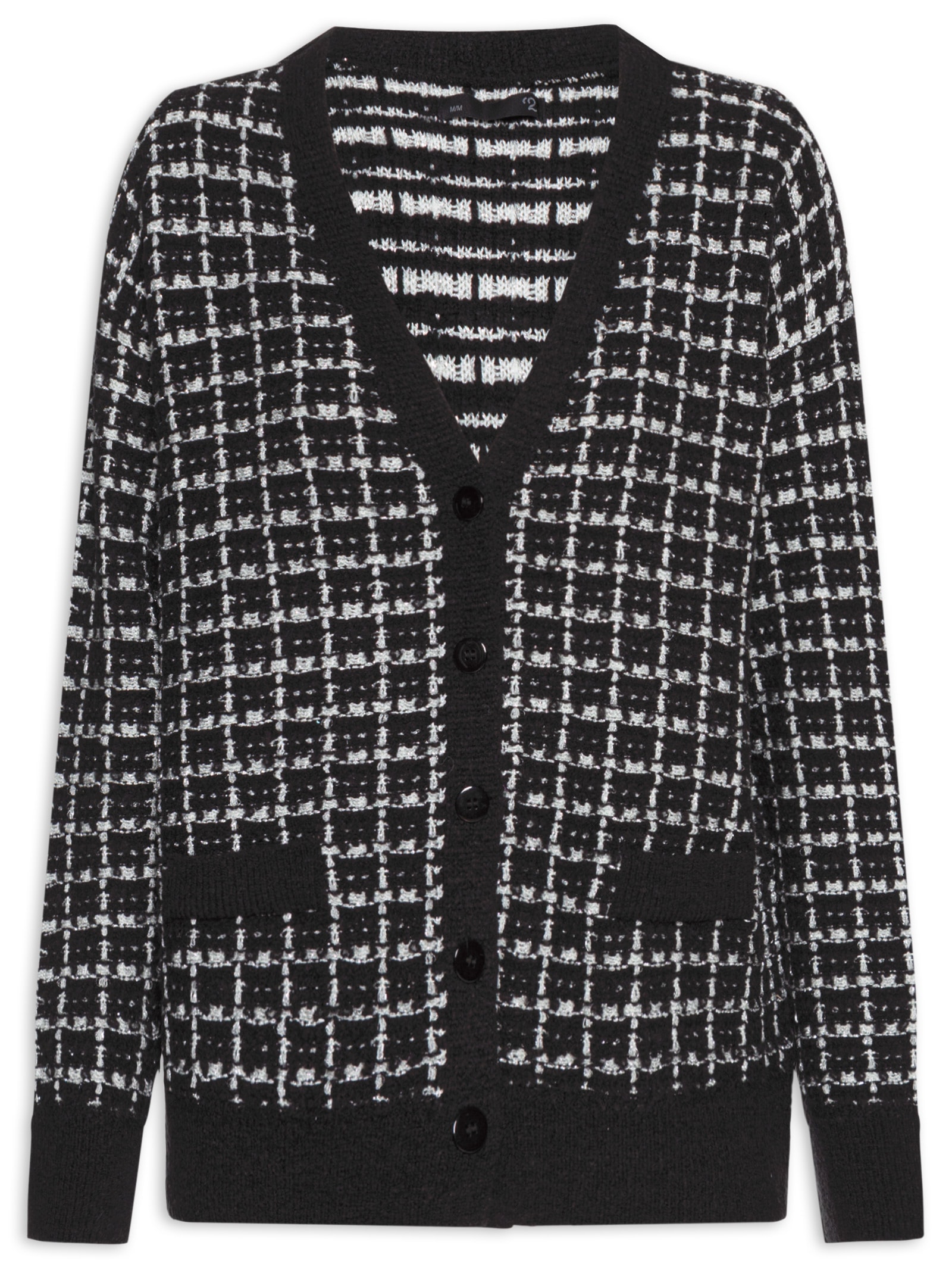 O cardigan preto é confeccionado em tricot com fios lurex e alta elasticidade. A peça solta ao corpo possui decote V, ombros estendidos, mangas longas, padronagem xadrez em cores contrastantes, comprimento alongado, acabamento canelado e fechamento frontal por botões.