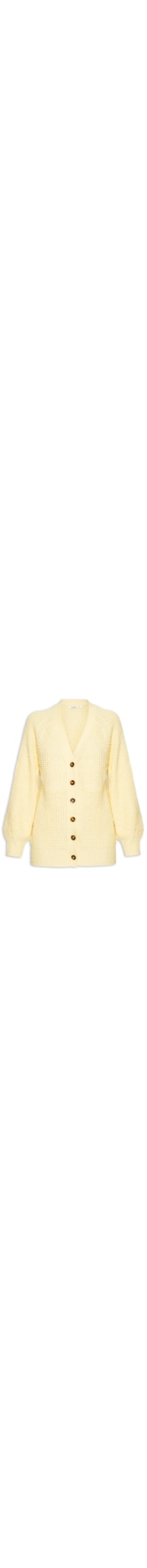 O cardigan amarelo é confeccionado por tricot com alta elasticidade. A peça solta ao corpo possui mangas longas, ombros levemente estendidos, acabamento canelado por punhos, gola e barra, fechamento por botão e comprimento alongado.