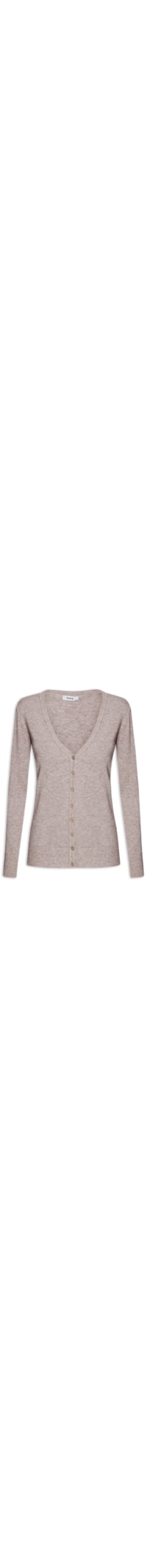 O cardigan bege é confeccionado em tricot de alta elasticidade. A peça solta ao corpo, possui decote em V, mangas longas, acabamento canelado e fechamento frontal por botões.