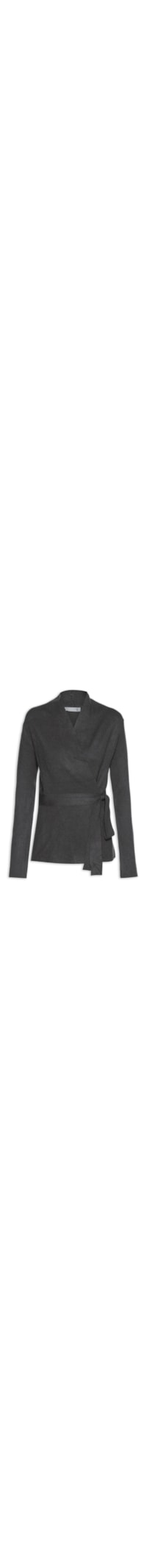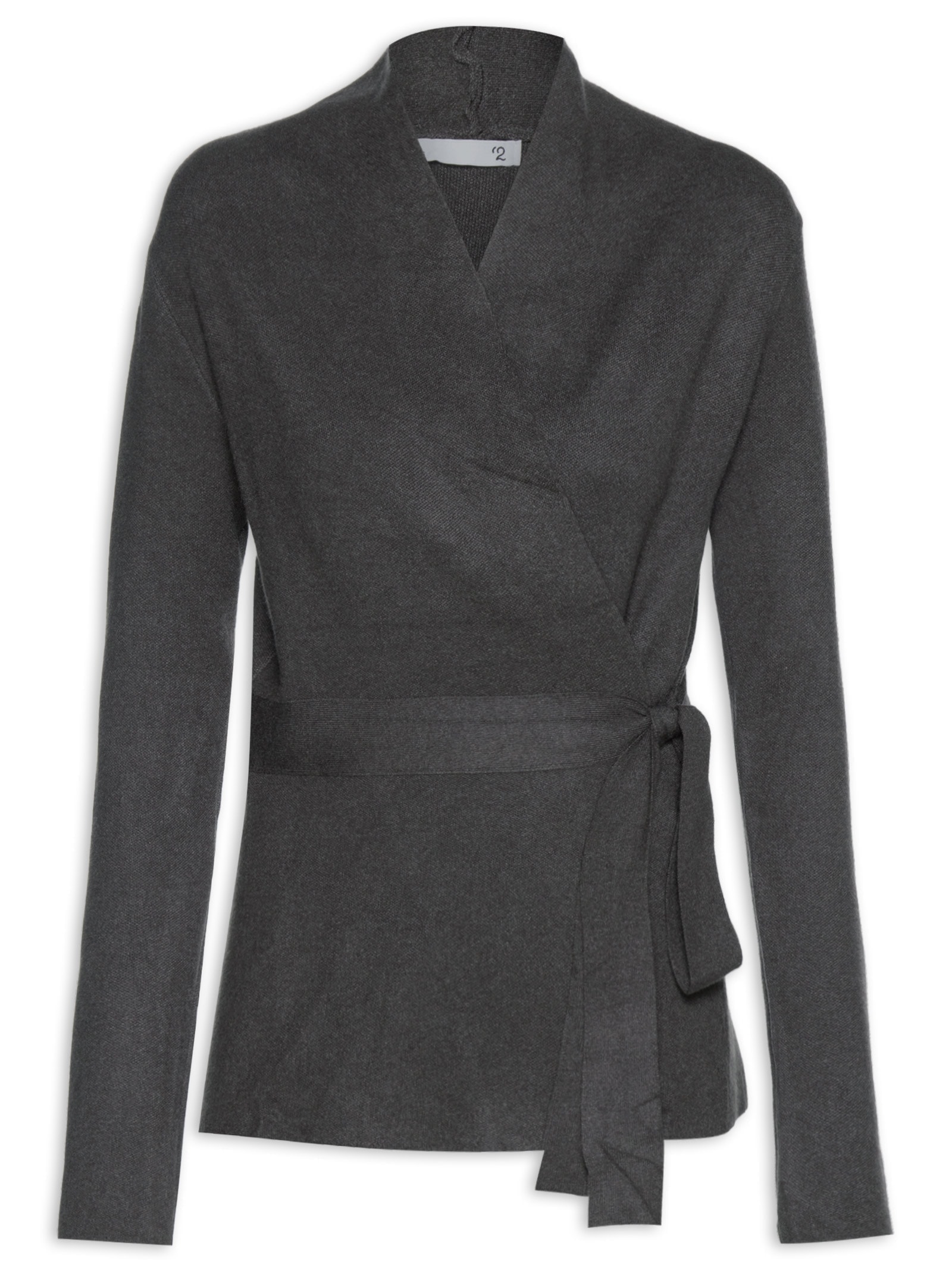 O cardigan cinza é confeccionado em tricot com alta elasticidade. A peça solta ao corpo possui decote V transpassado, ombros estendidos, mangas longas e tira sobreposta aplicada na cintura e parte posterior para amarração frontal.