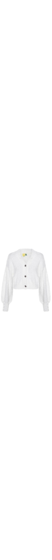 O cardigan branco é confeccionado em tecido leve com superfície em pelos e baixa elasticidade. A peça solta ao corpo possui decote V, mangas longas com punhos ajustados, comprimento cropped* e fechamento frontal por botões.