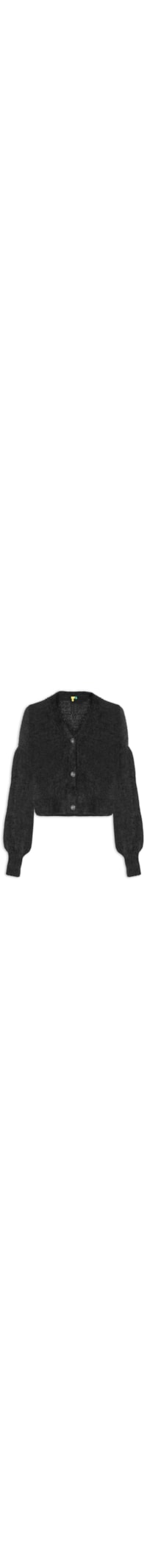 O cardigan preto é confeccionado em tricot com alta elasticidade. A peça solta ao corpo possui decote V, mangas longas bufantes, comprimento cropped* e fechamento frontal por botões.